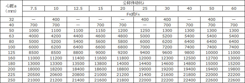 減速器輸出軸軸端的徑向許用負荷FR或軸向許用負荷FA       (N)